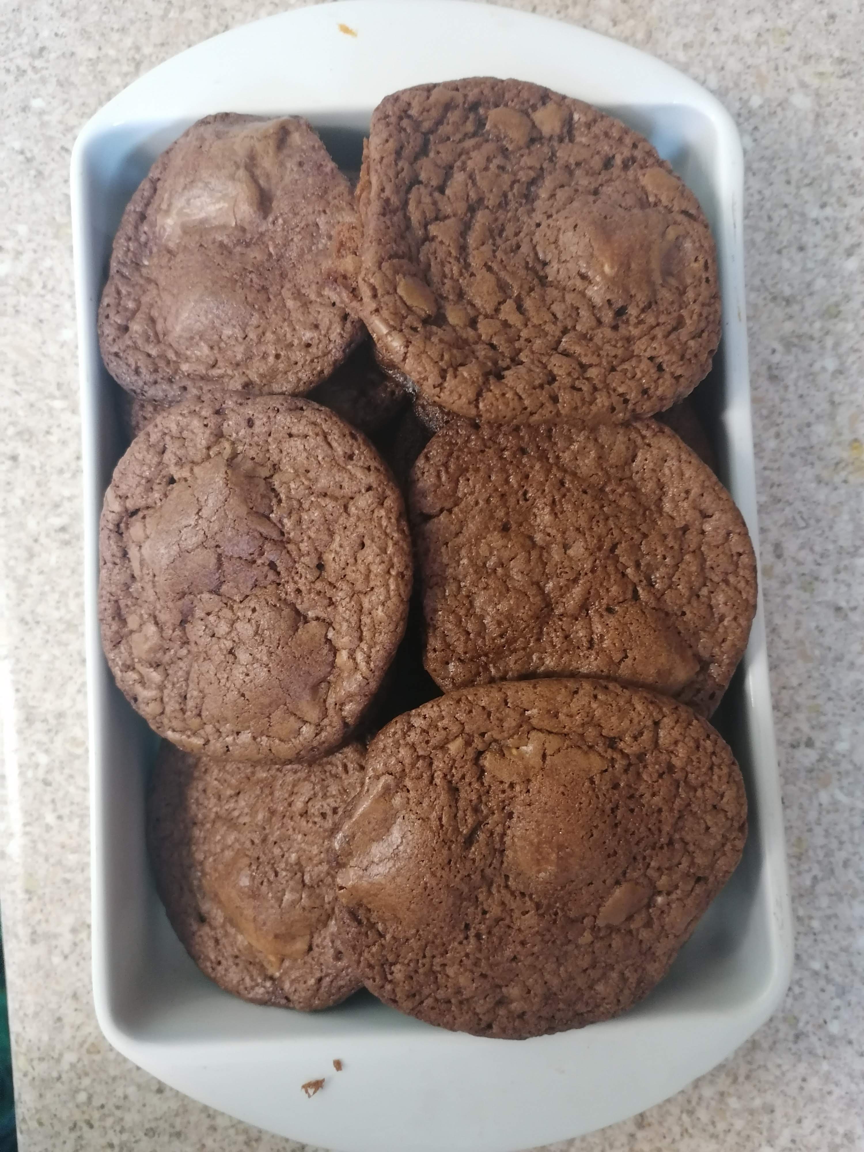 As you can probably tell from the photo, my cookies were not triple chocolate. While I used the basic recipe listed below, I had to make a change to it due to a lack of dark chocolate. It seems that I am always missing one ingredient these days! Even so, chocolate cookies are still chocolate cookies and they are certainly family favourite.